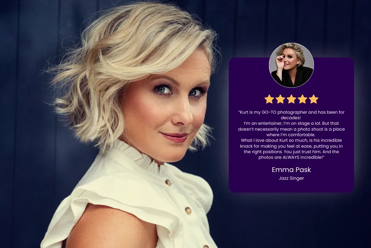I have had my headshots done by Kurt twice now and I wouldn't use anyone else - he is not only charming, hilarious and authentic but incredibly skilled at putting his subjects at ease and capturing their essence. The only bad thing is trying to choose the photos - there are too many gems.
